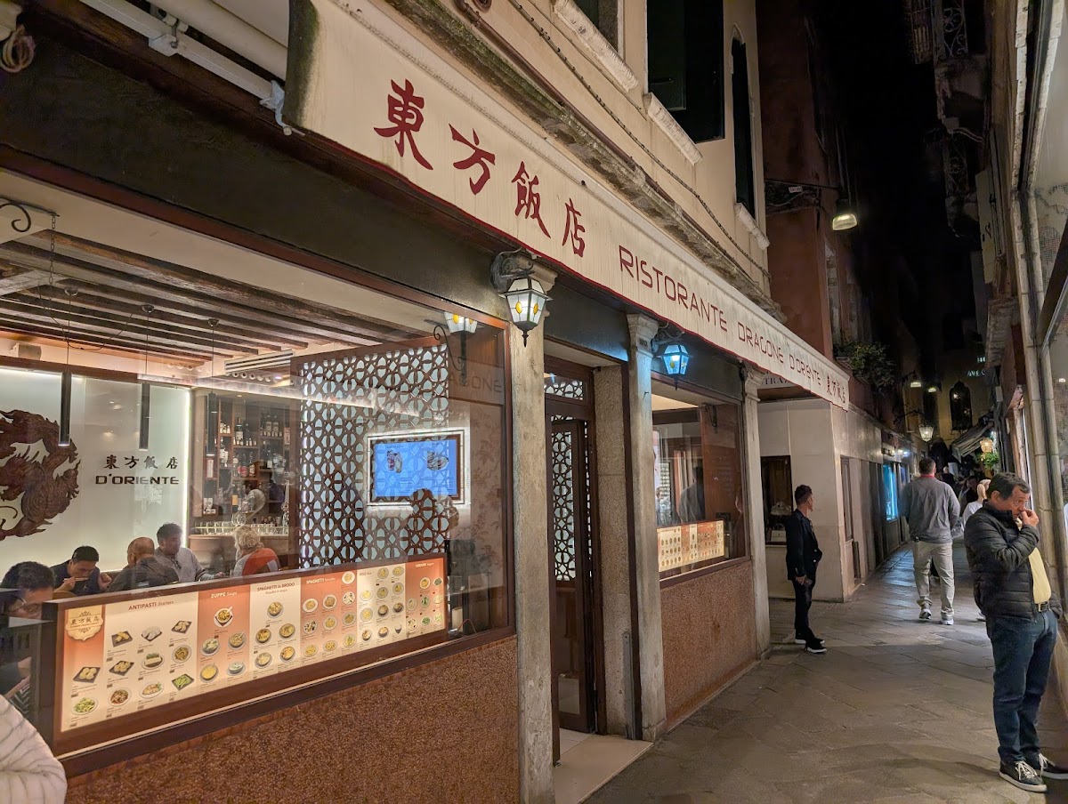 This Chinese restaurant is located in the heart of Venice and serves both Chinese and Italian dishes. The seating area is larger than it appears, with additional tables at the back of the restaurant. We had dinner there and tried several Chinese dishes, which were quite good. The service was quick and friendly—they even held onto a jacket we had forgotten, which we were able to pick up the next day. It’s a great spot to dine when you're looking for a break from Italian cuisine. There's also a gelato parlor right in front of the restaurant, which is excellent.